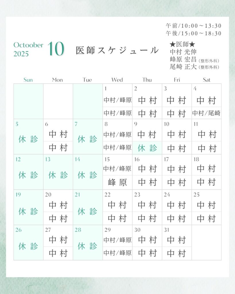 2025年10月 医師スケジュールを公開いたしました。 2025年9月24日 【10月の休診日のお知らせ】 いつもご来院いただきありがとうございます。10月は下記の日程で診療時間が変更となります。 09日(木): 午後お休みとさせていただきます ご不便をおかけして申し訳ありませんが、どうぞよろしくお願いいたします。 URL Copied!